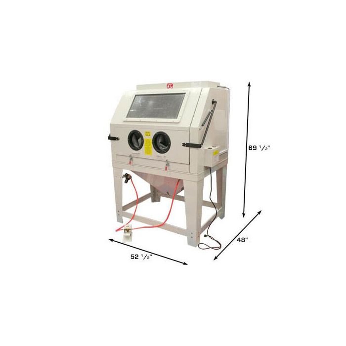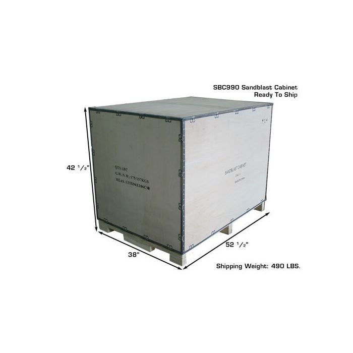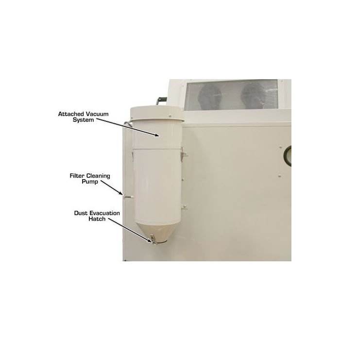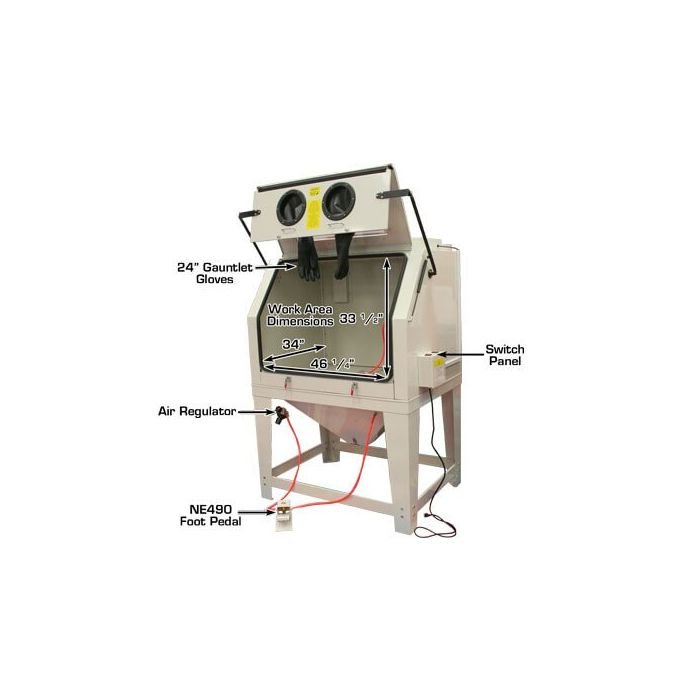 The 990 sandblast cabinet features a large front folding door for easy loading and unloading. It has excellent lighting and a very powerful vacuum system. The lower hopper stores the abrasive material for use and reuse and opens easily to allow easy removal of any media.