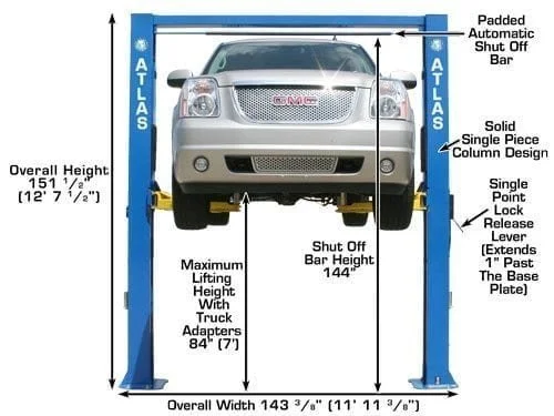 The Atlas® OHX10000X two post commercial grade above ground lift is the perfect choice for those large commercial repair facilities or the “Mr. Homeowner” who demands the highest quality at the absolute best price. The Atlas® OHX10X is a TRUE 10,000 lb. capacity two post lift that offers a great value to the customer. The Atlas® OHX10000X was engineered and manufactured to lift vehicles ranging from Smart Cars® to a one ton diesel dually. Extra lifting height and extra width between the columns allows the operator to work on all sizes of vehicles and offers a “fudge factor” of about 6 inches when “driving through” to another part of the building or lifting the van or “ladder truck”. If you are over 6′ 2″, the Atlas® OHX10X has longer cylinders which allow the vehicle to be “lifted” about 3 inches higher than many other lifts.