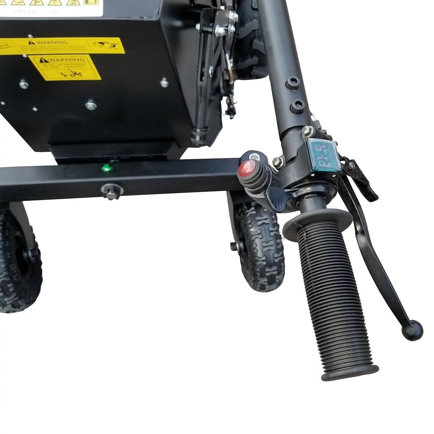 An electric hydraulic lift cylinder tips bucket to 90 degrees vertical to clean and dump your load. No need to shovel everything out or strain to tip a heavy load anymore! For more safety, the dual front-wheel drive, and throttle bar speed control with articulated floating rear wheels keep your load level and steady even over less than fully stable ground and with ease.