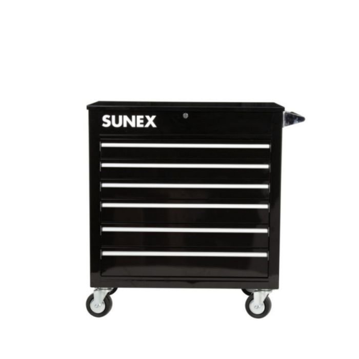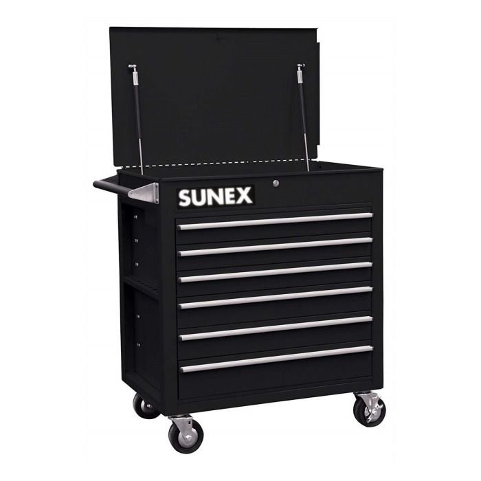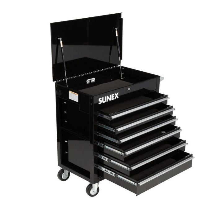 The Sunex Tools Professional 6-Drawer Tool Cart features 18 gauge steel construction, 500 lbs. load capacity, gas shocks, locking top bin, ergonomic push handle, and four heavy-duty 5″ x 2″, 2 locking swivel casters. Drawers are full extension with roller bearing drawer slides. Tool cart ships fully assembled.