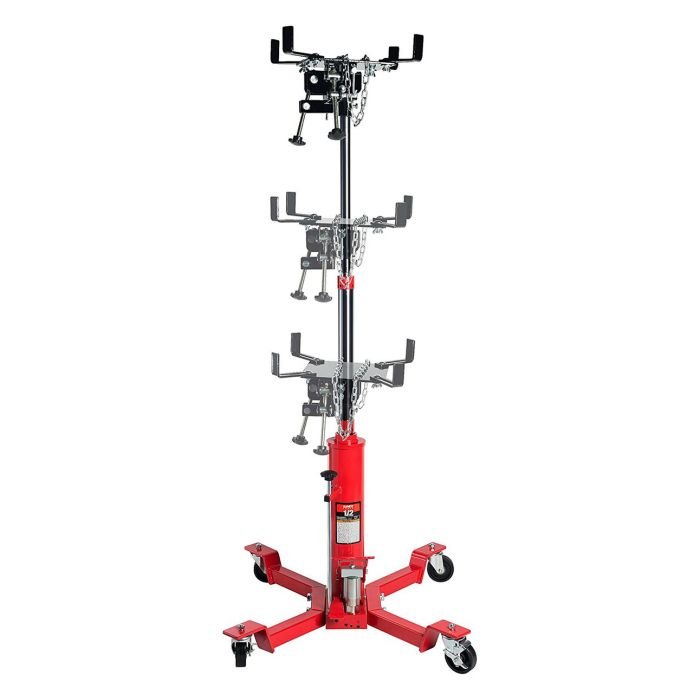 The Sunex Tools Telescoping Manual Transmission Jack allows a single technician to remove, move, or install heavy transmissions and transfer cases for vehicles on a lift. The wide chassis distributes the load safely and keeps the load stable. The universal saddle bracket is adjustable in four directions of tilt that allowing for easy positioning of the load. The low lift height allows for easy transfer to the workbench and the max lift height accommodates all technicians.